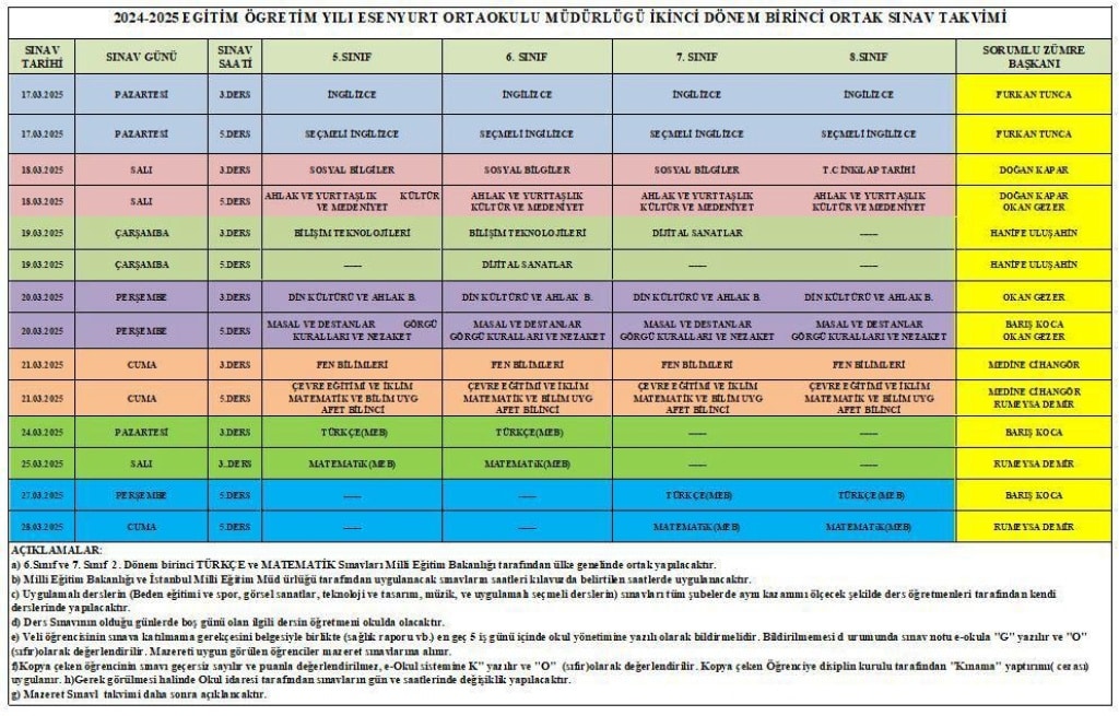 2. Dönem 1. Ortak Yazılı sınav takvimi